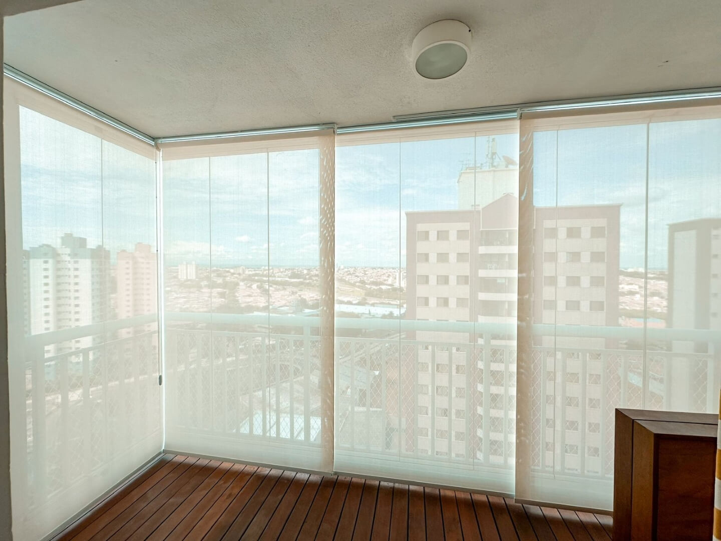 Voil Gaze de linho são tecidos translúcidos, que permitem que a luminosidade externa passe parcialmente para dentre do ambiente. O acessório tem a capacidade de controlar a temperatura e claridade do local, além de garantir privacidade.